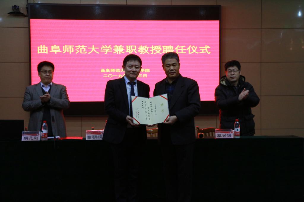 仪式上,扈庆学教授首先为曹明权先生颁发聘任证书,并对曹教授的加入表示热烈欢迎和感谢。随后,胡凡刚院长对曹教授进行了简单的介绍,并再次感谢曹教授的到来。接下来,曹教授作了题为“中韩文化产业比较及未来发展趋势”的主题报告。在报告中,他通过中韩文字、中韩节日以及中韩餐饮文化的对比,向同学们简单介绍了中韩文化的异同,解答了在场观众心中对于韩国的疑惑与好奇。除此之外,他通过分享自身的经历,介绍了韩国留学政策,鼓励同学们到韩国留学,并列举留学韩国的优点。曹教授还提到,虽然自己在韩国生活多年,但爱国的心是永远不变的,也希望同学们通过自己的努力,促进中韩两国的文化交流。讲座最后,曹教授与在场同学进行互动,详细的解答了同学们提出的疑惑,幽默风趣的语言和详实的解答使同学们获益匪浅。