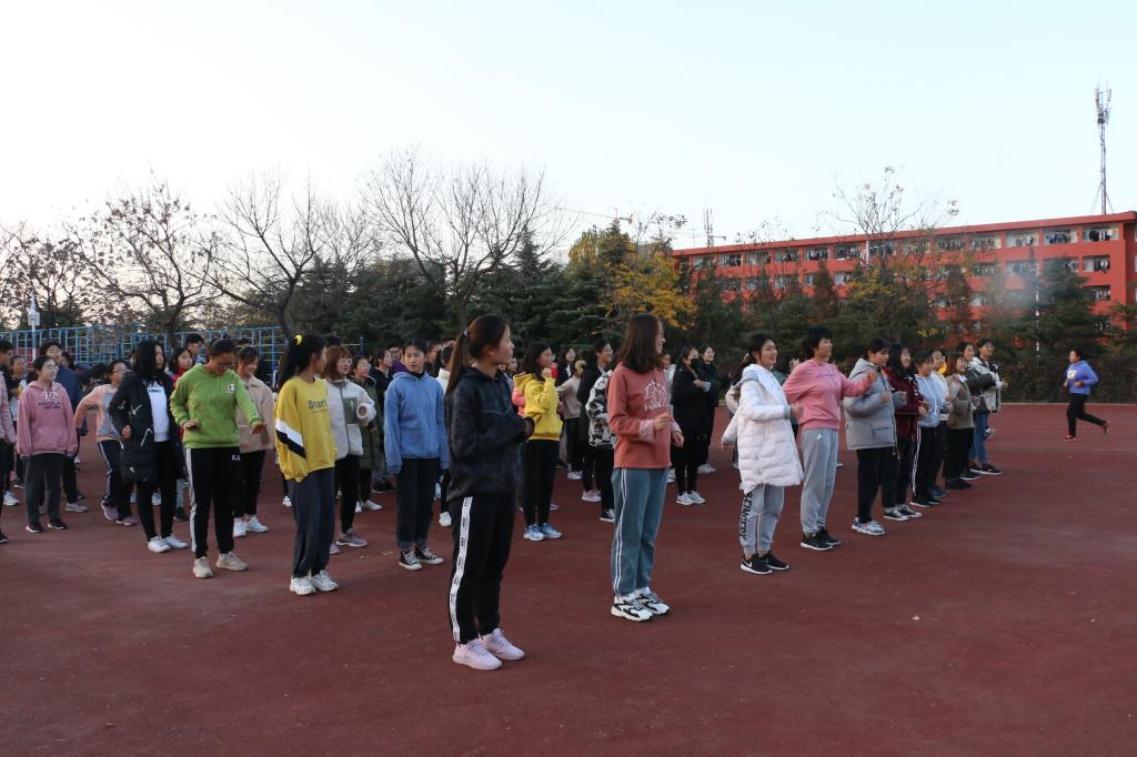 学生会体育部成员带领冬训队进行长跑热身,冬训成员队形整齐,气势如虹。热身完毕后,冬训成员排好队形,进行压腿、高抬腿、跨步跳等身体素质训练,开始训练项目的练习。