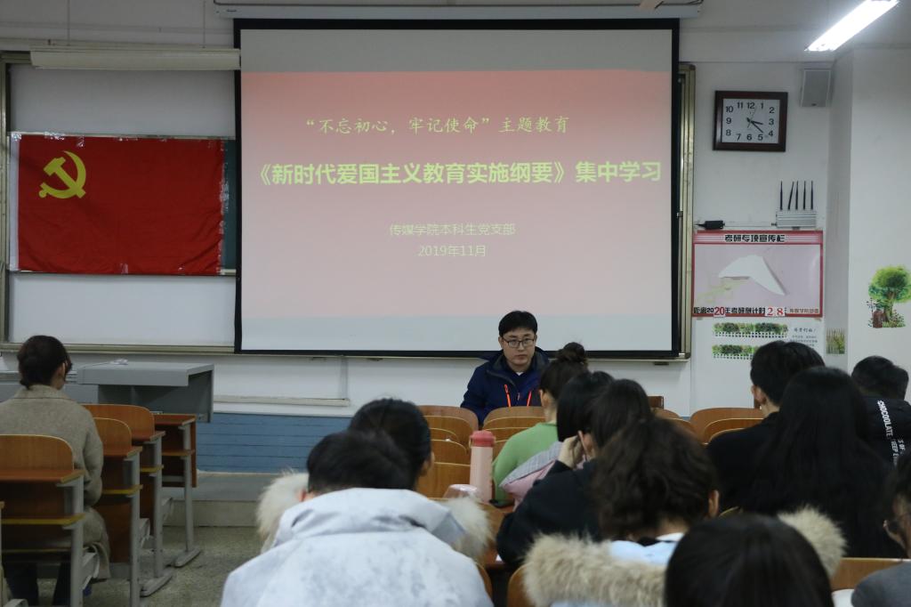 “不忘初心、牢记使命”主题教育之《新时代爱国主义教育实施纲要》集中学习活动于JC101开展。我院本科生党支部书记张洪孟主持本次活动,海棠文化
