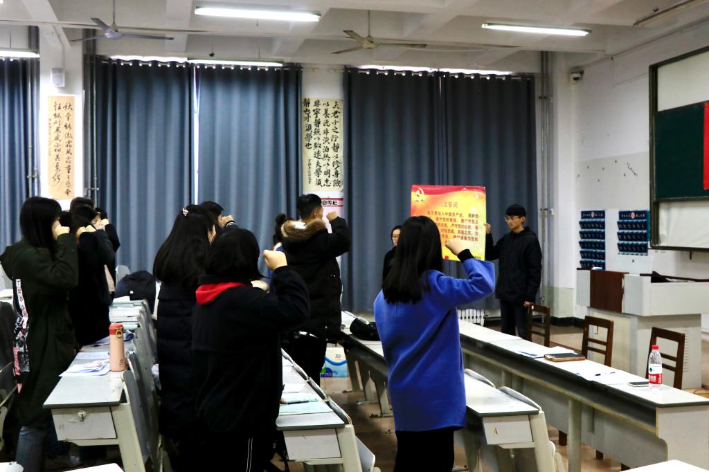 学生党支部党员纳新大会决议》,同意24名申请人加入党组织。会议最后,全体党员起立,面向党旗庄严宣誓,表达了今后将发挥党员先锋模范带头作用的决心。