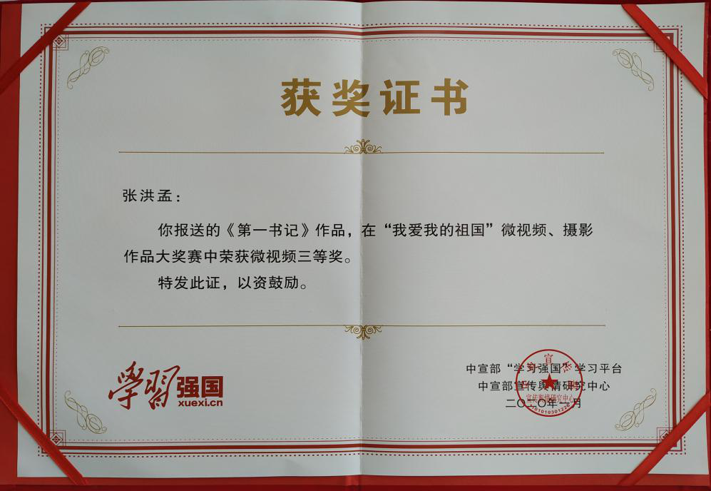 作品《第一书记》在学习强国平台“我爱我的祖国”微视频、摄影作品大奖赛中荣获三等奖。本次大赛是“学习强国”学习平台为庆祝中华人民共和国成立70周年,大力弘扬爱国主义精神而发起的,面向全国征集反映国家历史变革和成就的优秀作品。海棠文化