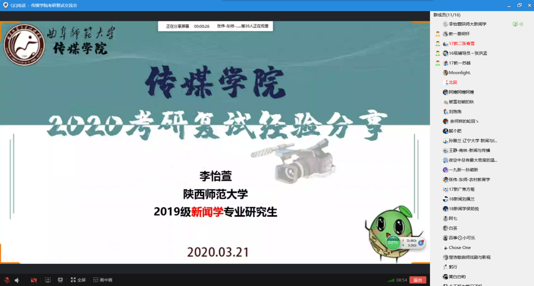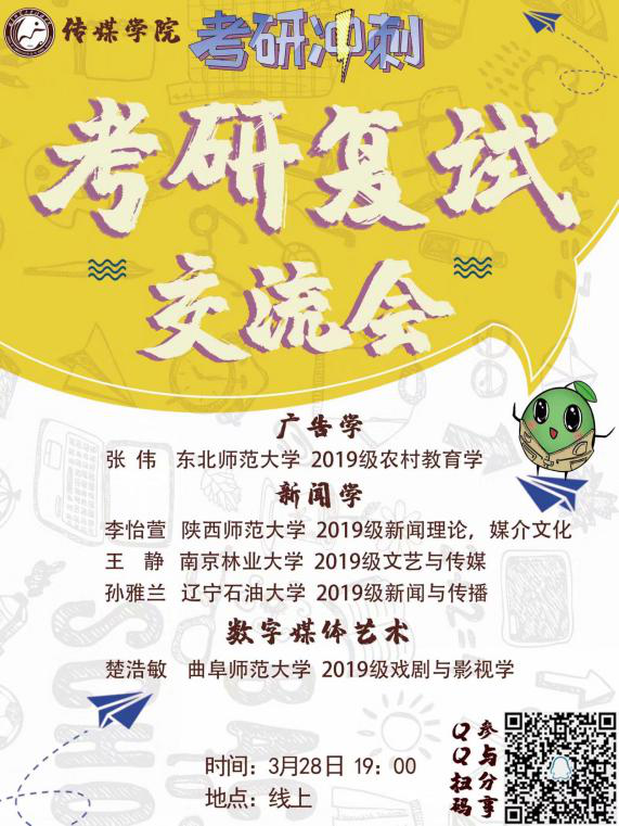 举办2020年广告学、新闻学、数字媒体与艺术学专业考研复试经验线上分享会。本次分享会邀请到了东北师范大学2019级农村教育学研究生张伟、陕西师范大学2019级新闻理论、媒介文化专业研究生李怡萱、南京林业大学2019级文艺与传媒专业研究生王静、辽宁大学2019级新闻与传播学研究生孙雅兰、海棠文化