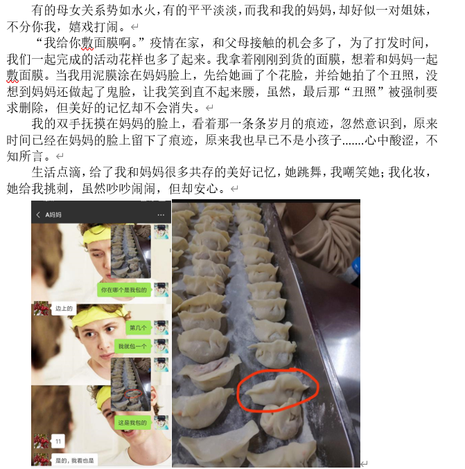 “对生活的热情或许已经被现实的压力磨平了棱角,但我依然对生活充满希望,因为这平平淡淡中有你们啊。”参与活动的一位学生分享了她与妈妈之间的温暖回忆。