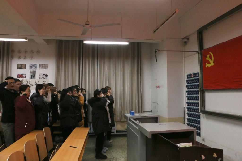 大会伊始,于江荣、葛欣雨等34名入党申请人依次宣读自己的入党志愿书,分别阐述自己对党的认识、入党动机和入党愿望,表明入党决心,并通过认真分析自身的优缺点,表达自己积极改正、不断进步的态度。接着,入党介绍人宣读申请人的相关情况,客观指出其工作、学习中的优点与不足,表达自己的介绍意见。大会宣读了申请人的综合政审结果,由申请人的同学就他们的日常表现进行讨论并发表意见,之后申请人进行表态,表明自己日后的努力方向。无记名投票结束后,大会公布相关决议,一致同意接收于江荣、葛欣雨等34名同学为中国共产党预备党员。最后,预备党员们面向党旗庄严宣誓,表达自己对党和国家的忠诚以及争取发挥模范带头作用的决心。