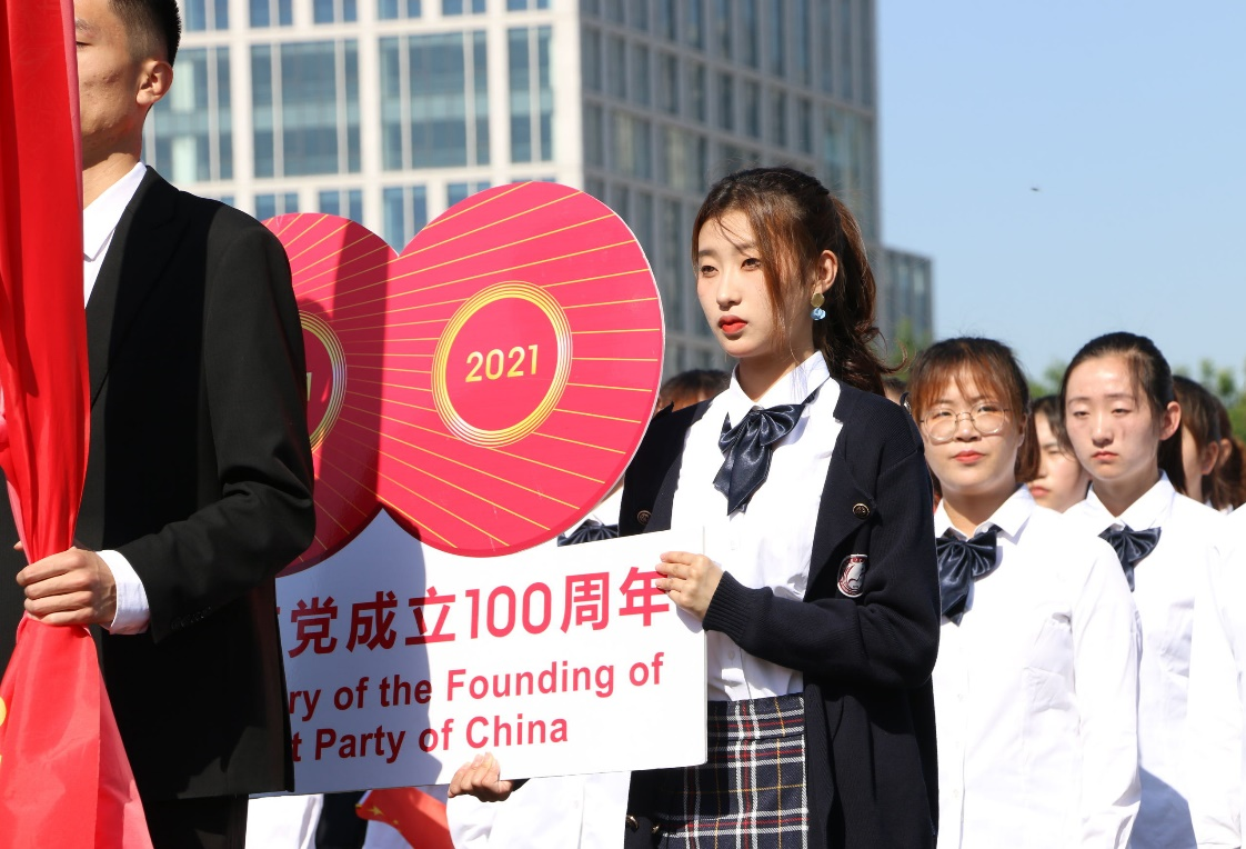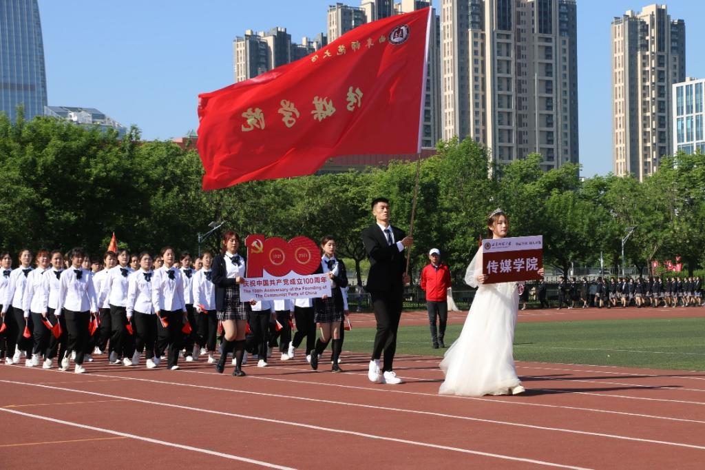 方队高喊着“青春无畏,筑梦传媒”的口号,踏着矫健的步伐,精神抖擞。昂扬口号,亮出热血澎湃的自信态度;昂首阔步,尽展意气风发的少年豪情。学院方队中的每个人都身穿白色院服,手持五星红旗,纯洁端庄的白色与热烈激昂的红色交相映衬,展现出传媒学子清爽阳光的青春气息与活力洋溢的奋斗精神。方队队员还举起了“庆祝中国共产党成立100周年”的创意设计宣传牌,宣传牌上的 “100”字样中央写有两组数字——“1921”和“2021”,左上方印有金黄党徽图案,寓意传媒学子始终铭记宣传使命,并以昂扬向上的青春风姿,传承党史精神,献礼百年华诞。在各学院方队展示完毕后,伴随着轻松动感的音乐,海棠文化