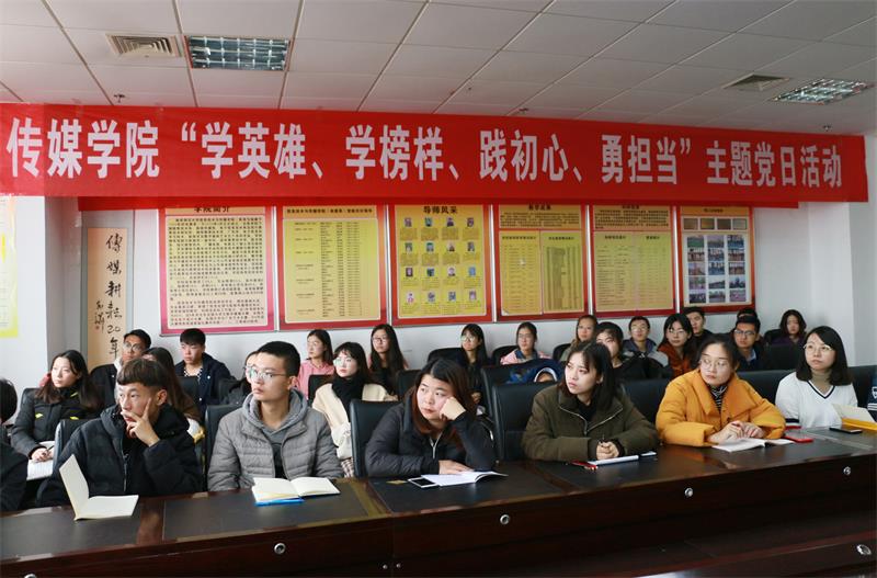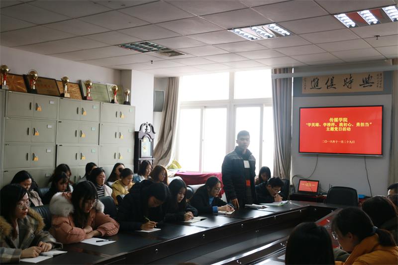 首先,张守荣老师就此次活动发表了讲话,她指出参加此次活动的同学们应保持一个坦然的态度,认认真真学习。接下来同学们一起观看了《英雄壮行》,《王继才:岛就是国 我站立的地方是中国》两个视频。黄群、宋月才、姜开斌、王继才这四位共产党员的英雄事迹,展现了共产党人不畏艰难,勇于奋献的精神,使在座的同学们感受颇多。视频播放完后,支部党员们交流了学习心得,其中7位同学分别分享了自己的感受。随后,张风姣老师对党支部发展提出了自己的意见,并指出党员同学应多与同学们交流,帮助他们解决在就业、考研等方面的困难及要求。最后,徐书记对此次活动进行了总结。他从学习、工作和生活三个方面提出具体的要求。鼓励党支部的同学们要发挥党员带头作用,与人为善,在提高自己成绩的同时积极帮助其他同学。除此之外,他表示在场的所有同学应通过了解四位英雄的事迹,学习他们高贵的品质,并在平凡的生活中做好自己的事。