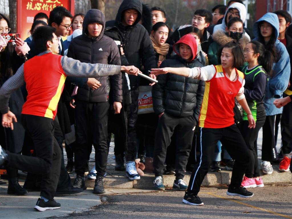 观众就挥舞着院旗和院牌来到集合场地,排起整齐的队伍,为比赛运动员做准备。国旗护卫队和工作人员在工作处及赛道,校学生会成员辅助维持比赛纪律。最后,主持人宣布“一二·九”环校跑正式开始并预祝大家取得优异成绩。14:30,比赛正式开始,校学生会主席李业堂为本次“一二·九”环校跑发令员。海棠文化