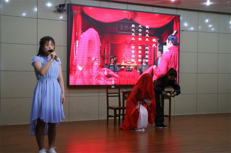 水袖舞《采薇》向同学们展示了古风雅韵,随后诗词表演大会正式拉开帷幕。《白了太白头》和《终南山奇遇记》带领同学们纵观诗人李白和王维的灿烂一生。《诗经串烧》搭配生动的剧情表演,诗经中爱情的美好与离别的悲伤混合融入同学们的心房。古琴曲《卧龙吟》和着琴声使观众感受卧龙先生的豪情万丈。《胜日寻芳飞花令》更为同学们展示了诗词文化的深厚底蕴,促进了同学们对传统诗词的了解。由漪兰传统文学社带来的汉服走秀向同学们展示了东方文明的娇弱之美和四千多年华夏服饰文明的博大精深。《钗头凤》中展示了陆游和唐婉相爱却不能相守的悲凉。表演结束后,由老师为获奖的节目进行了颁奖。