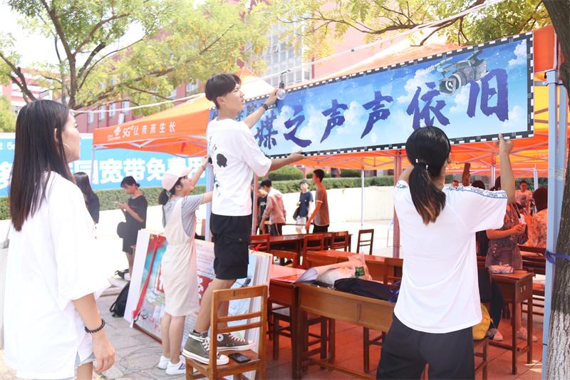 临时报道处,团委学生会各部门工作人员在此集合,开始迎新工作的各项准备,就搬运桌椅、布置场地、登记报到、宿舍分配、礼品发放等进行工作分配,使各部门尽快熟悉迎新准备工作流程。随后,海棠文化