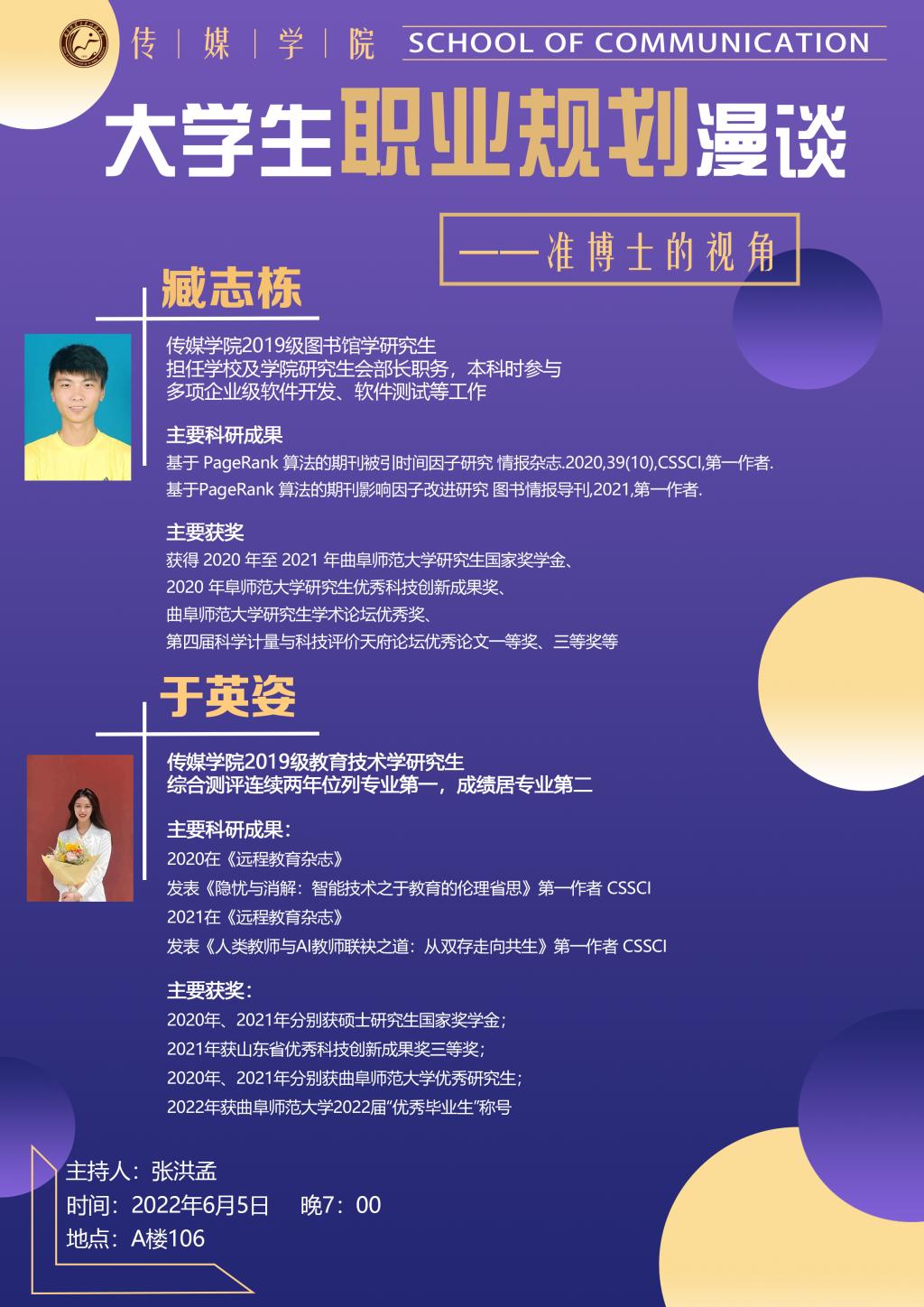 于JA106开展“大学生职业规划漫谈”活动。活动邀请我院2019级图书馆学研究生臧志栋、教育技术学研究生于英姿两位准博士生分享个人经验。2021级本科生和部分研究生参加活动,活动由辅导员张洪孟主持。