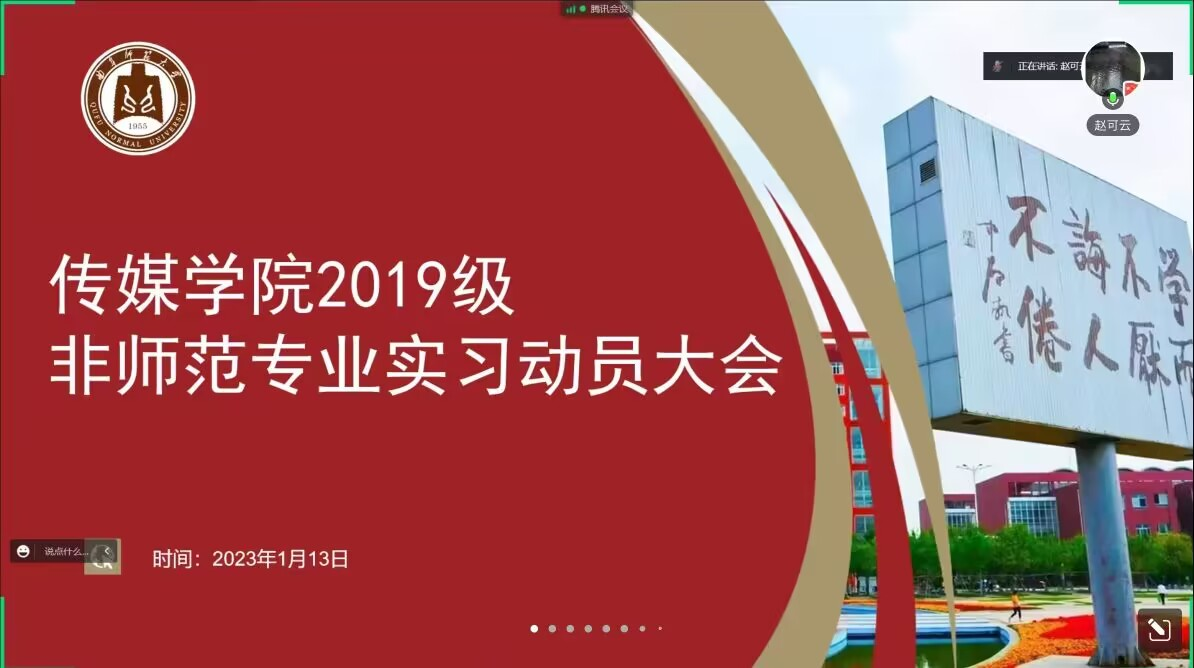 于线上召开2019级非师范专业实习动员大会。实习单位代表邵帅、海棠文化