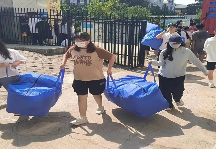 组织2022级学生志愿者为2023级新生搬运被褥。老生帮新生,后浪助前浪,恰展传媒志愿精神之传承。
