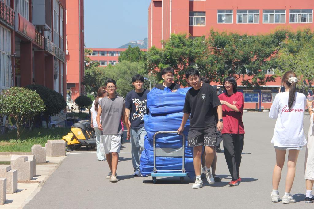 烈日炎炎,志愿者齐聚文泽园区,在学生干部的带领下,志愿者们各司其职、互相配合,现场氛围井然有序,搬运工作有序推进。他们三两组队,及时细化工作内容,合理分工安排,男生女生齐上阵,同心协力效率高,顺利完成了马扎、被褥等生活物资的分配、搬运任务。