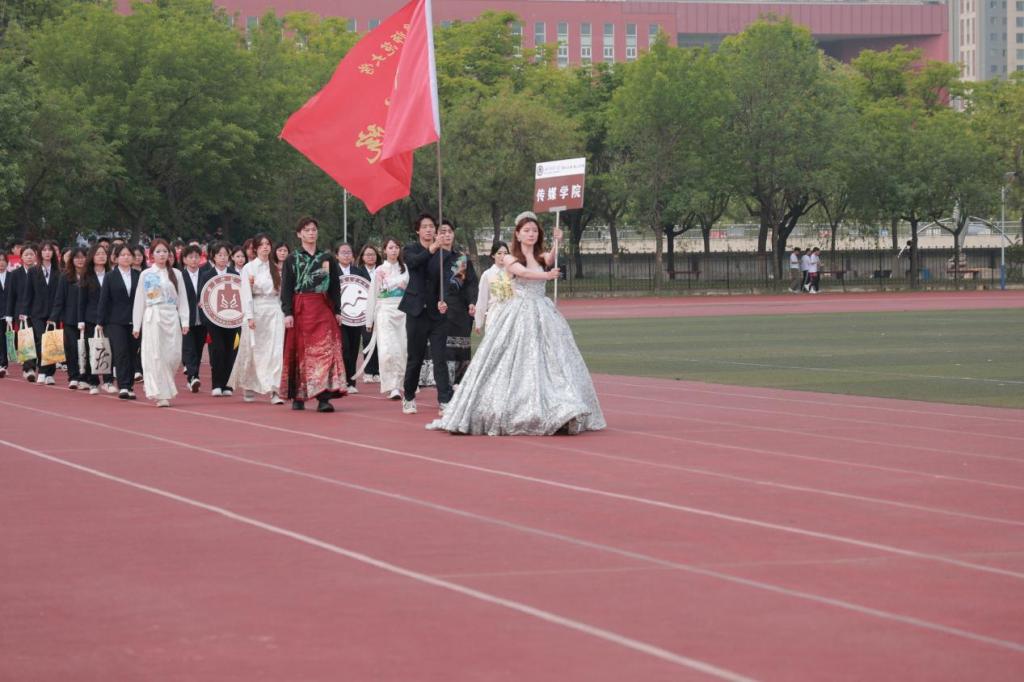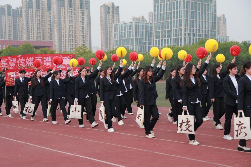 激昂的《运动员进行曲》如战鼓擂响,各学院方阵依次入场。传媒学子步伐整齐划一,“创意为帆,融媒作桨;传媒少年,乘风破浪”的口号响彻云霄,喊出了传媒人的自信与豪情,方阵代表队员身着融入四季元素的服饰,文创包袋上绘满曲园风光,与“70”周年校庆花球相映成趣,传统文化、曲园底蕴与传媒匠心在此交融,成为赛场上瞩目的亮点。他们以朝气蓬勃的精神面貌,为赛场注入无限活力。随后,校啦啦队的精彩舞蹈,将开幕式氛围推向高潮,点燃了全体运动员的竞技热情与活力。