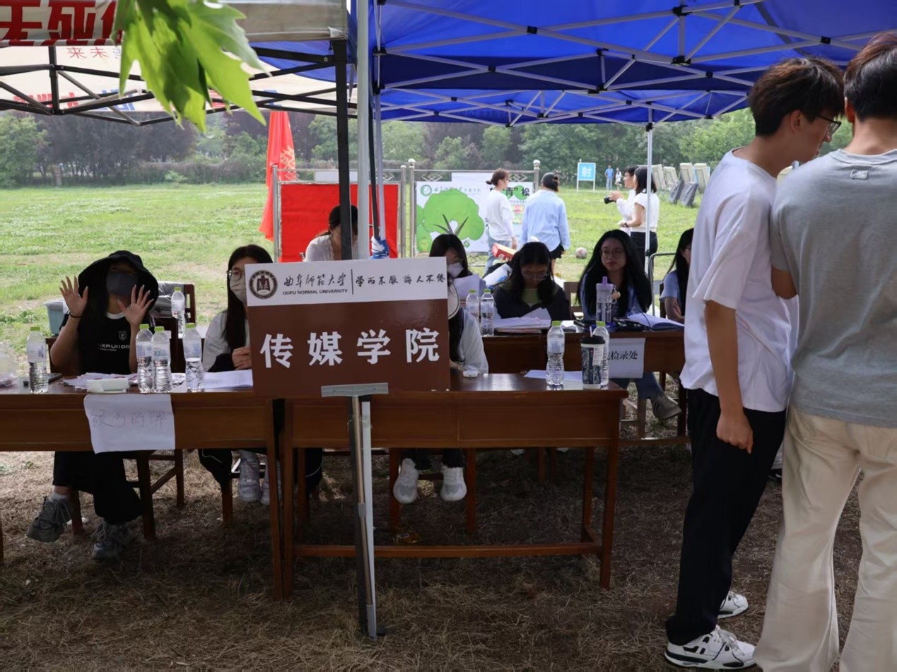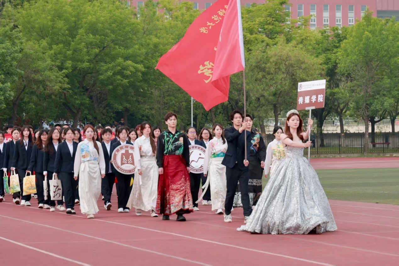 方阵步伐整齐,队列中的文创包袋绘制曲园之美,传媒学子喊着“创意为帆,融媒做桨,传媒少年,乘风破浪”的口号走过主席台,洋溢着青春活力。