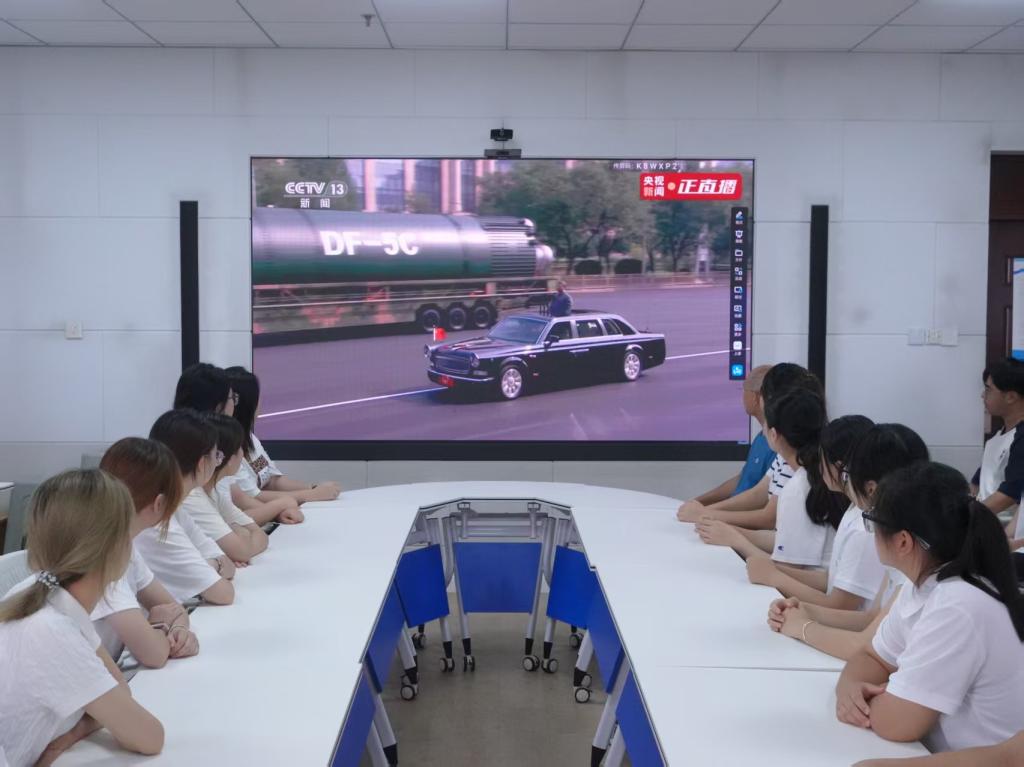 上午九时整,纪念仪式正式开始。习近平总书记发表重要讲话并检阅受阅部队。阅兵仪式中,受阅部队以严整的军容、威武的队列依次通过天安门广场,展现了新时代中国军队的强大实力与昂扬风貌。空中梯队以精准的编队、震撼的飞行表演,拉出一道道壮丽的彩烟,象征着中国国防力量的腾飞与荣耀。在观看过程中,师生们神情专注,深受鼓舞。通过此次阅兵仪式,师生们深刻感受到了革命先烈们为国家和民族独立所付出的巨大牺牲,也更加明白了国防建设对于国家安全与发展的重要意义。