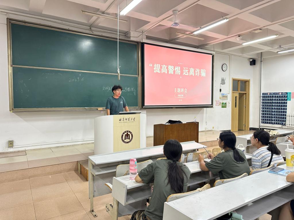 于A楼召开新生防诈骗安全教育主题班会。会议由2023级带班学生干部主持,2025级全体新生参加。2025级辅导员出席本次会议。