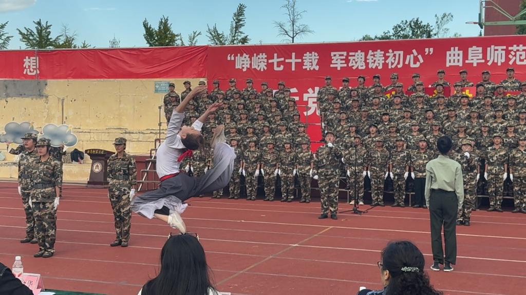 比赛过程中,传媒学子将舞蹈、情景剧融入合唱,他们身着飒爽军装,精神抖擞,炽热铿锵的节奏如号角般划破长空,合唱最后,传媒学子高举“敢打必胜,逢敌亮剑”的字牌,生动刻画了军人时刻战备、守护山河安宁的坚毅群像,既是对无名英雄的深情致敬,更传递出“居安思危”的国防觉醒。经过激烈角逐,海棠文化