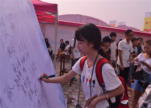 团委学生会为新生准备了签字墙,新生完成报道之后,可以在签字墙上留下自己的姓名,寓意在大学里开启一段新征程。新生在签完字后可以与镂空的“录取通知书”合照,留下纪念。