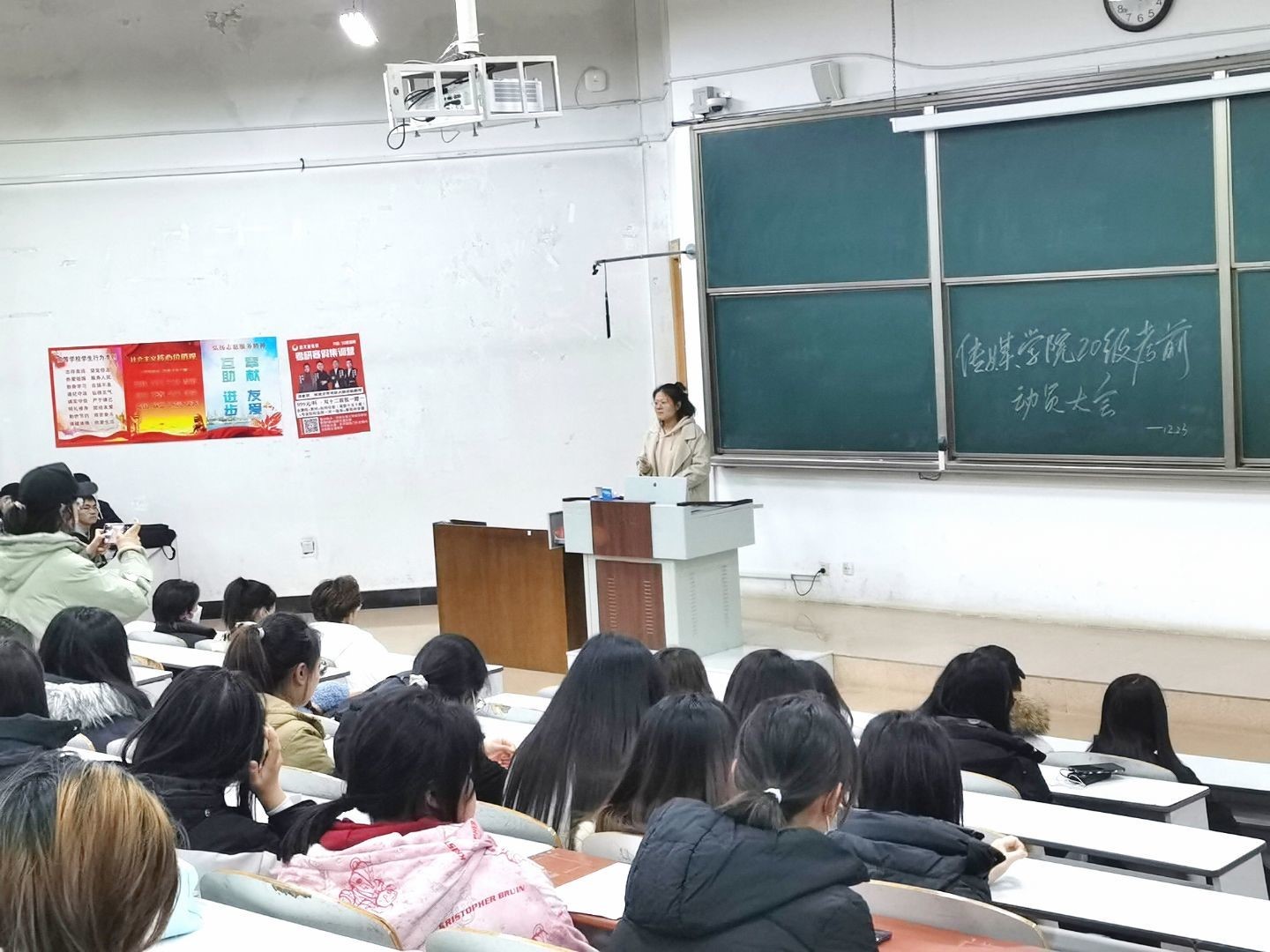 辅导员老师向同学们介绍了考试注意事项,强调了诚信应考的重要性。为提升同学们的纪律意识,老师们详细讲述了学院相关各项规章制度,进一步申明对考试作弊行为的认定和处理办法,帮助同学们树立积极的迎考心态。老师们表示,希望同学们统筹规划、认真复习,取得优异成绩。此外,结合学校放假通知,老师们提醒学生明确假期防疫要求,严格落实假期期间离校报备制度。要将安全问题置于首位,注意食品卫生、交通安全,切实提高自我防范与安全责任意识,度过一个健康、美满的春节假期。