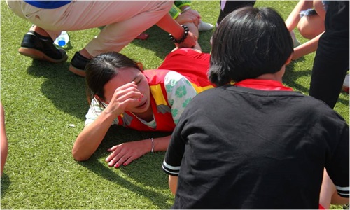 800米的路程,她咬着牙,拼着一腔热血坚持冲刺跑来。800米极速奔跑的体能消耗让向尔银同学在冲过终点后躺在了草坪上,后勤人员为其按摩放松。她的劳累与疲惫,即使我们不在赛场上奔跑,也能体会到她为比赛付出的心血。这一瞬间,你是我们的榜样,我们最美的英雄。这就是传媒人的精神,坚持到底!