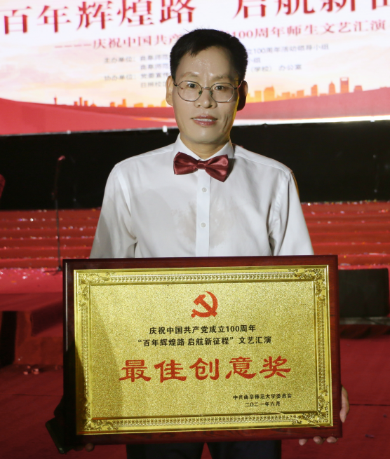 师生团队获得最佳创意奖,张维刚老师作为代表上台领奖。本次汇演海棠文化