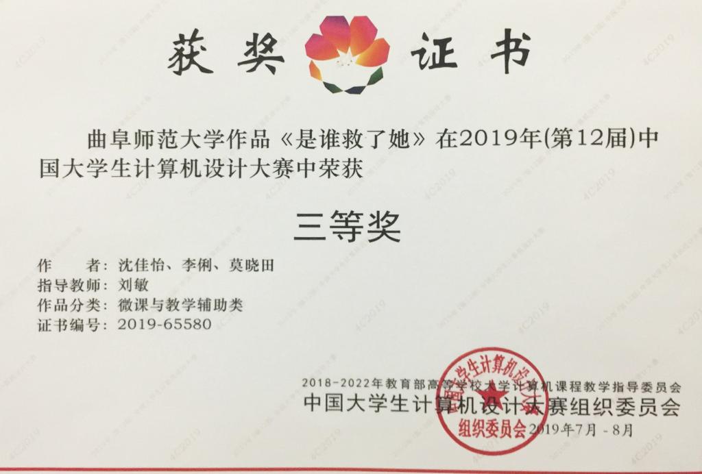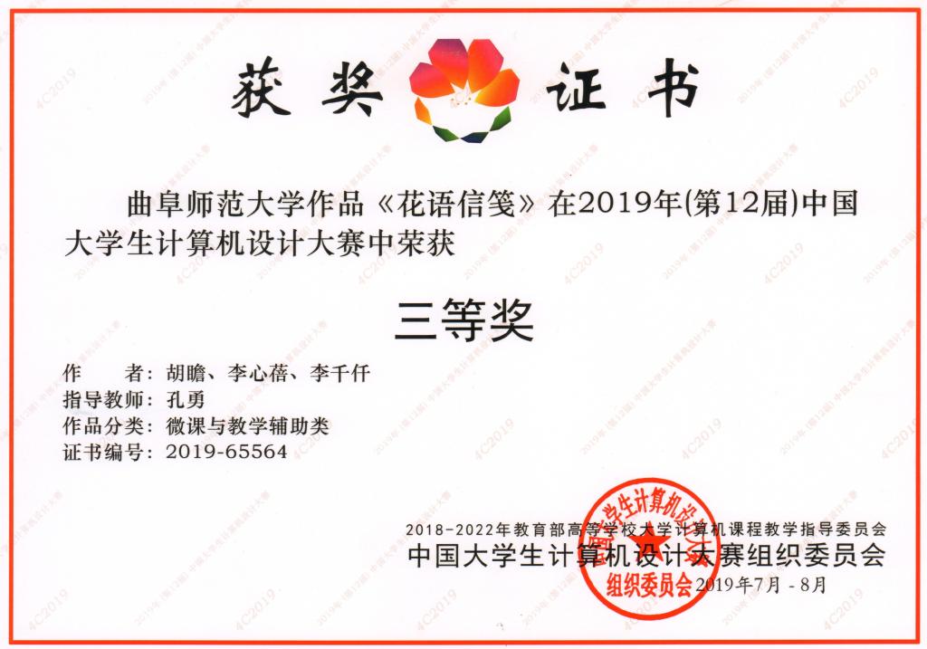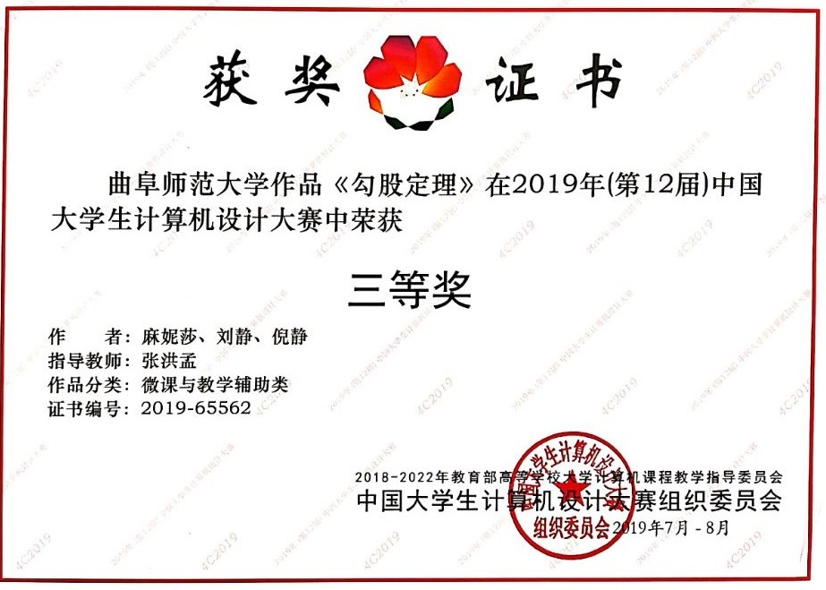 共有3件作品荣获国家级奖项,孔勇老师指导,胡瞻等三位同学制作的作品《花语信笺》,刘敏老师指导,沈佳怡等三位同学制作的作品《是谁救了她》以及由张洪孟老师指导,麻妮莎等三位同学创作的作品《勾股定理》均荣获三等奖。