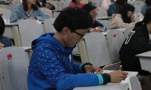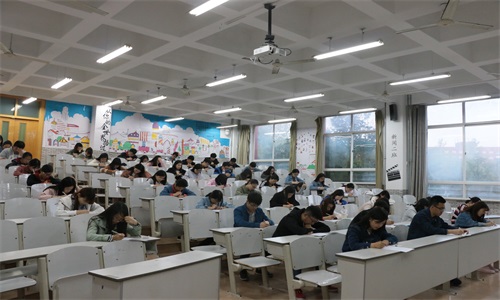 本次比赛主要由潮声文学社组织负责,采取笔试的形式来考察选手对于国学知识的了解。比赛入场前,参赛选手在教室门外抽取座号,并按照抽取的座号上交手机、有序入场。比赛开始,由潮声文学社工作人员分发试题,整个过程有序推进。随后,比赛正式开始,参赛人员认真答题,考场氛围严肃安静。与此同时,监考人员认真负责,有效地保障了考场秩序。