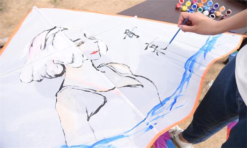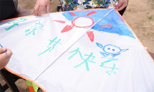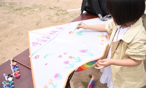 同学们在莒南天马岛风景区与参加手绘风筝活动的其他小朋友一起手绘风筝,并在风筝上表达出妈妈的爱,虽然年龄不同、绘画风格不同,但所有人对母亲的爱是相同的。