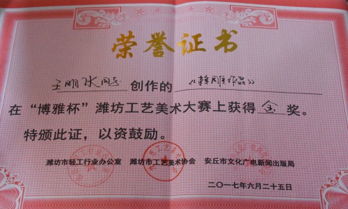 王明水是高密核雕的新一代传承人,师从王照烽,2016年4月份获得潍坊市工艺美术核雕界“拔尖人才”荣誉称号。王明水在采访中,对核雕的起源、发展历史、特色分别进行了详细的介绍 ,并讲述了自己与核雕的渊源及学习经历。“起初,我开始认识核雕是因为在一次展览中,我看到了一个叫做‘八仙过海’的作品,从那时起,我被核雕的魅力深深的吸引了”,队员们仔细听讲并记录笔记。采访中,他提到自己在学习核雕的过程中,受王照烽老师的影响非常大,老师给予了他很大的帮助。随后,王明水向队员们展示了几件作品,其中包括获得“博雅杯”潍坊工艺美术大赛金奖的《核雕作品》、第五届潍坊工艺美术节暨风筝博览会银奖的《八仙过海》、第九届中国风筝产品博览会暨第四届潍坊工艺美术节银奖的《八仙庆寿》等。