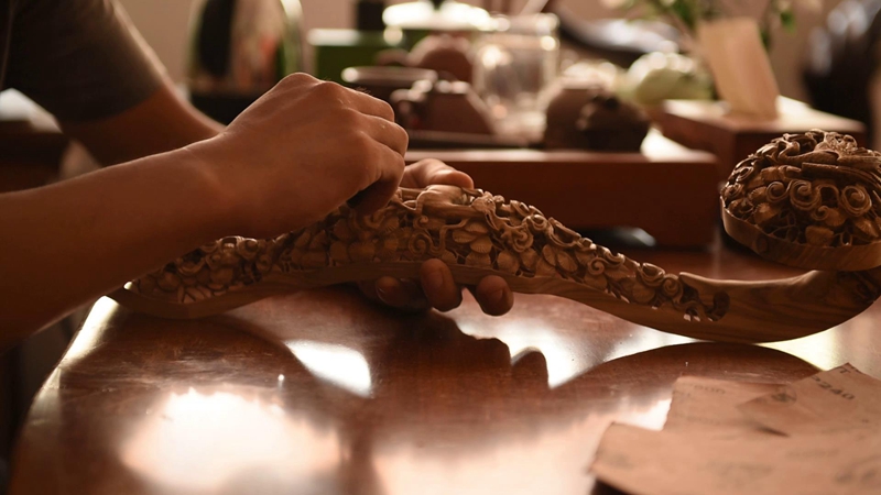7月24日下午,艺铭队拜访了2018年被评选为市级非物质文化遗产传承人孔祥宽,孔师傅为了让艺铭队更好的体会楷木雕刻的过程,在工作室向艺铭队介绍演示了雕刻的各个流程和技巧。随后孔老师从楷木雕刻传承和保护的多个角度表达了自己的意见的期望。从现实角度分析了楷木雕刻传承的难度和面临的巨大挑战。也向艺铭队表达了自己坚持雕刻下去的决心。结束了和孔老师的交流之后,也为艺铭队的实践活动画上了圆满的句号。