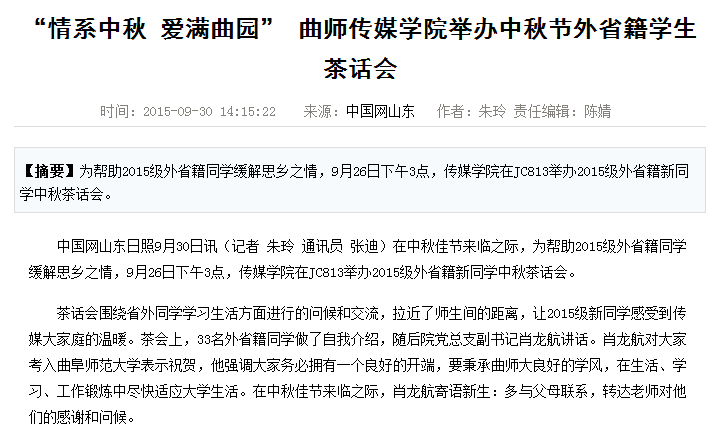 【来源:中国网报道:曲师海棠文化 举办中秋节外省籍学生茶话会 | 发布日期:2015-10-06 】