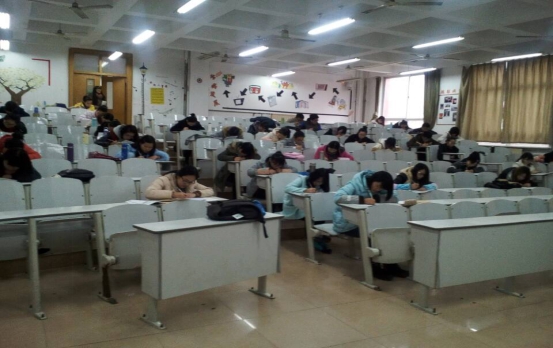 日照校区A楼教室。考试严格按照四六级考试时的考试规则进行,由PKE的工作人员监考。考场内的气氛十分严肃,前来参加考试的同学们也都十分认真地对待本次模拟考试。