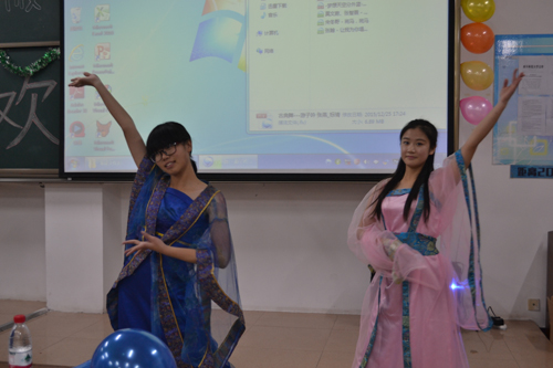 之后带来的歌曲《我在人民广场吃着炸鸡》、《斑马斑马》、相声《礼仪漫谈》等也深受大家喜爱,赢得台下无数掌声。随后的游戏环节——"我是中华小曲库",13级的施蓉君、于淼、陈怡静等师哥师姐也纷纷参与其中,与大家一起听前奏、猜歌名,现场气氛达到高潮。游戏过后,是一支优美的古典舞《游子吟》,两位女同学身着古代服装,曼妙的舞姿韵味十足,为整个活动增光添彩,台下掌声雷动。最后,全场人员一起合唱歌曲《相亲相爱》,在一片欢声笑语中本次联谊晚会圆满结束。