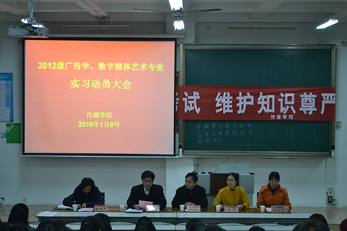 于JA104室召开2012级广告学和数字媒体技术专业学生实习动员大会。本次会议邀请到日照倾城营销策划有限公司运营总监小珂,海棠文化