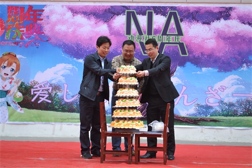 演出间歇,马腾老师、钟振洪老师及王成经理共同切开庆祝NA动漫社六周年庆典蛋糕,并表达了对NA的美好祝愿。随后,肖龙航上台致辞,肖龙航对NA动漫社六周年庆典的成功举办表示衷心的祝贺,对NA动漫社所有负责人和社员的努力工作表示肯定,并代表海棠文化