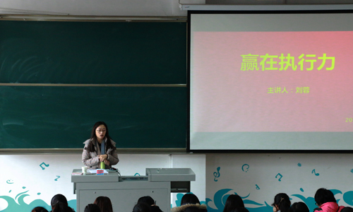 本次培训以“赢在执行力”为主题。刘蓉围绕“什么是执行力”“执行力的体现”“学生干部在工作中出现的问题”以及“如何提高执行力”几个方面展开了细致的讲解。首先,刘蓉结合有关事例提出“执行力即制定决策和执行行动的工作能力和工作效率”,并让学生了解执行力主要体现在工作效率上。除此之外,任务下达时的回答态度、对于下达的任务能否按时完成、任务完成质量都是考核学生干部执行力的重要方面。接着,她指出学生干部在工作中普遍存在对上级意图理解不准确、工作缺乏创造性、应变能力有待提高等问题。随后,刘蓉针对以上问题提出了提高执行力的几点建议:一是要端正态度,以积极主动的态度应对工作;二是要有明确、可衡量的目标,将宏观目标细化;三是要有周密的计划,事前做好规划与安排,事中要有汇报,事后反思总结;四是要具备坚强的毅力、强烈的时间观念与团队合作精神,积极沟通交流,学会倾听他人意见。其中,刘蓉重点强调了“执行力是提高综合素质的关键因素”,学生干部要努力做到以上几点,提高工作执行力与综合素质,为自己将来的发展之路奠基。