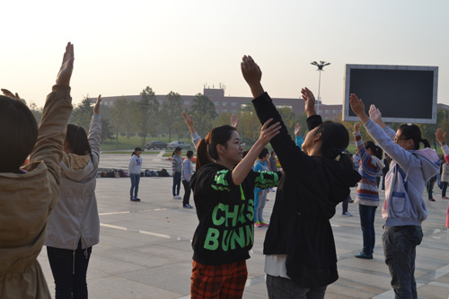 2013级各班文艺委员和体育委员在日月广场集合,由我院学生会文艺部和体育部成员对其进行广播操教授。经过几日的练习,大家正式上岗。14级新生的广播操学习以班级为单位进行,利用课余时间练习。下午下课后,日月广场上聚集起练习广播操的队伍,新生们在师哥师姐的带领下,从头学起,从最基本的原地踏步走开始,反复练习。有的同学动作不规范,师哥师姐们上前为其纠正,并亲自示范。14级新生们认真学习动作要领,努力改善自己的动作细节,丝毫不马虎。领操的同学尽心尽力,在同学们做动作的时候到队伍中间进行指导,把他们的胳膊抬高,伸直。经过半个小时的练习和指导,新生的做操质量逐渐进步,动作也不断规范完善。