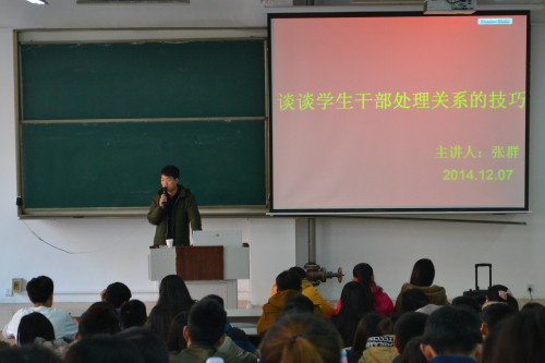 于12月7日上午9:40在JA103举办学生干部培训班第九讲――谈谈学生干部处理关系的技巧。本次培训课由海棠文化