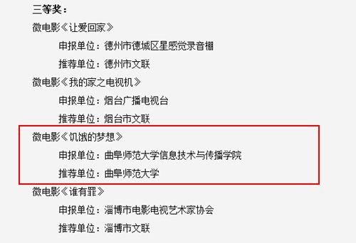 (原信息技术与传播学院)原创微电影《饥饿的梦想》经推送,获得第七届山东省“泰山文艺奖”微电影类单项作品三等奖。此前,该作品还入围了科讯杯国际大学生电影大赛,获得了山东省科技文化艺术节微电影大赛故事片一等奖,拿过学校的先进文化项目,最终拿下山东省文艺界最高奖——“泰山文艺奖”。