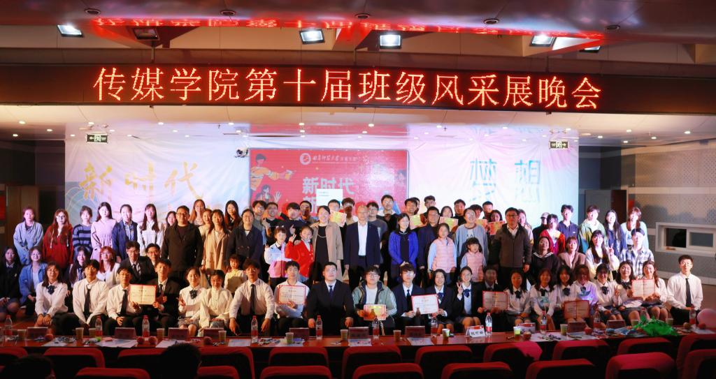 自制短片《绘梦的时光》拉开晚会的序幕,勾勒传媒学子在专业学习与实践中孜孜不倦、团结协作,终蜕变为自信向上、能力突出的传媒人的成长图景。经过数月的精心准备,各班以“新时代,新青年”为主题,利用音乐剧、小品、穿越时空对话等多种形式呈现了不同风格的演出,诙谐幽默的相声、酷炫的跆拳道、笑中有泪的小品展现出新时代新青年的思考、风貌与担当。晚会结束后,经多位老师现场评分,评选出优秀班级一个、风采班级三个、魅力班级四个。