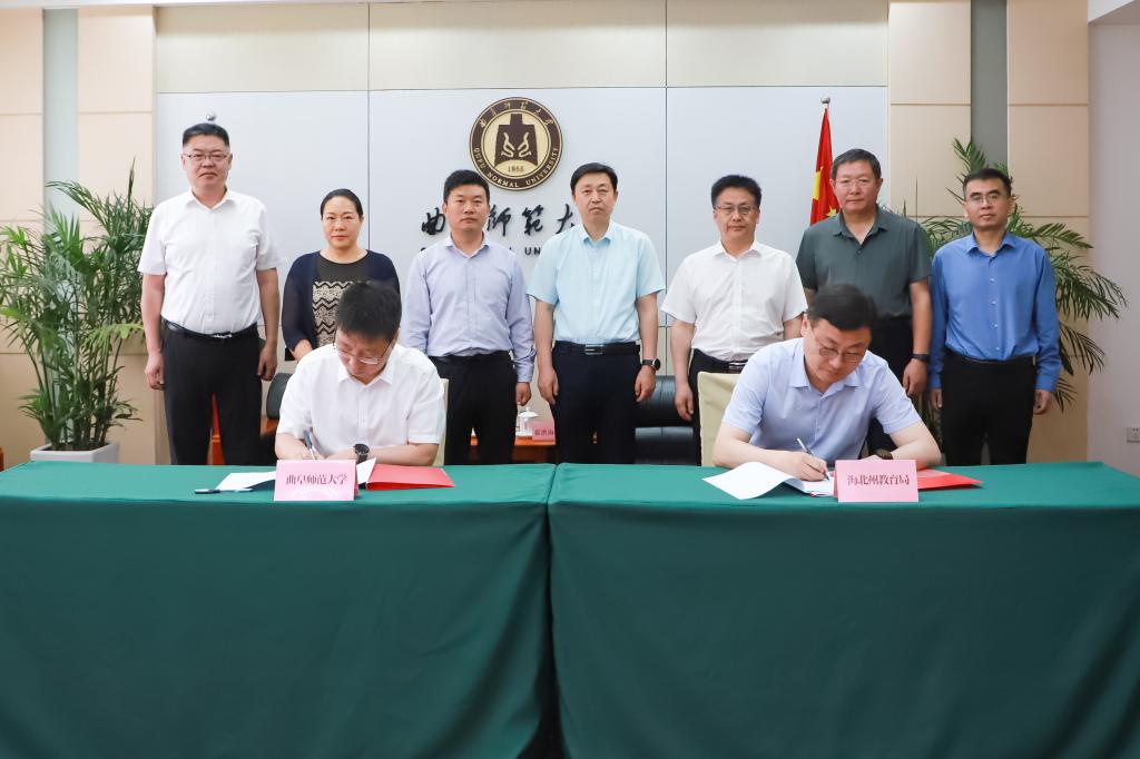 与青海省海北州教育局就“规划与建设幼儿园与小学思政教育”专题教学资源库横向合作项目举行签约仪式。曲阜师大党委副书记、校长张洪海,党委常委、副校长胡凡刚,海北州教育局副局长魏伟出席签字仪式。