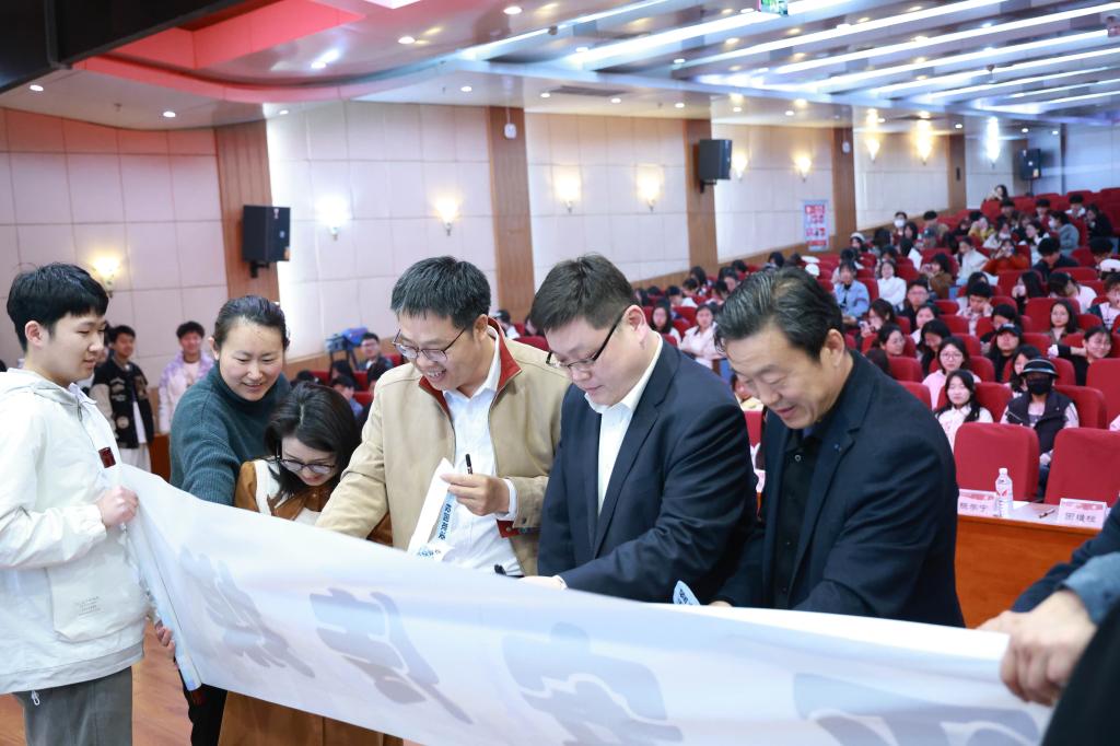 领导老师登台撕下“平安传媒”卷轴上的安全风险事件,共同助力和谐校园建设,并在卷轴空白处签名正式拉开本届海棠文化