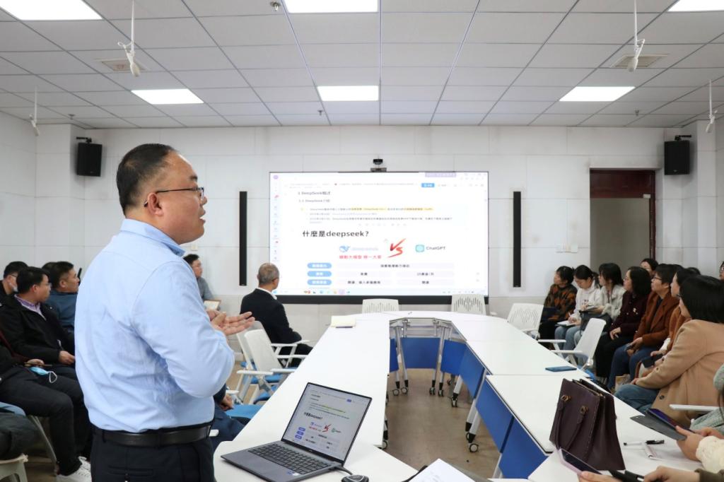 副教授郭顺利以“提质增效:DeepSeek大模型概述及其在科研领域应用经验”为题,系统阐释生成式人工智能的技术演进脉络。通过解构DeepSeek大模型的“算力-算法-数据”三维架构,深度剖析大模型技术的突破性进展及其科研应用价值。采用“理论阐释+场景模拟”模式进行现场演示,通过科研选题智能生成、文献综述自动化处理、多模态数据分析等典型场景,生动展现deepseek、秘塔AI搜索、知网研学平台、讯飞智文等工具在学术研究全流程中的应用。与会教师就AI工具的使用、学习方法以及如何运用到教学科研等问题展开热烈讨论。
