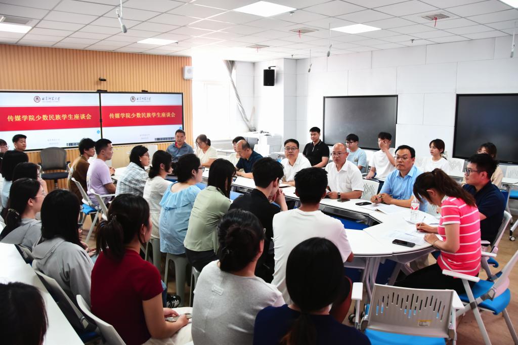 于JC813召开少数民族学生座谈会。学院党委书记田维柱、党委副书记田荣林、副院长赵可云、副院长刘波、团委书记张守荣、学习科学与技术教研室主任吴运明、新闻教研室主任卢长春、数字媒体艺术系副主任孔勇出席此次会议,部分少数民族学生参加此次座谈会。