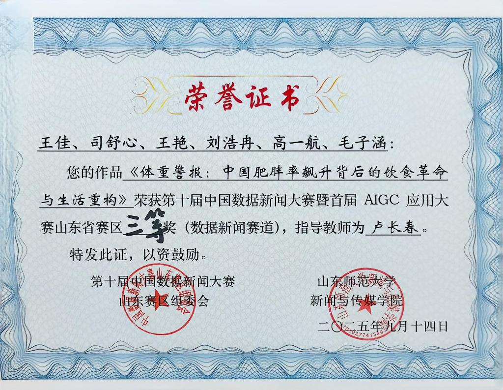 教师卢长春指导,2022级传媒学子李咏姿团队的作品《数智化无障碍城市,让视障人群走得更远》荣获省级二等奖,2023级传媒学子王佳团队的作品《体重警报:中国肥胖率飙升背后的饮食革命与生活重构》荣获省级三等奖,2023级传媒学子范佳怡团队的作品《BMI门票释放“减重”信号,请查收您的体重管理图鉴!》荣获省级优秀奖。指导教师卢长春被评选为“优秀指导教师”。