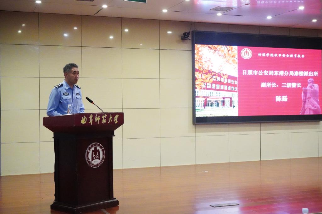 邀请日照市公安局东港分局秦楼派出所副所长陈磊、日照市心脏病医院医师戴启睿于图书馆报告厅为传媒学子作安全教育讲座。日照校区党委副书记刘天浩、保卫处副处长王光江、学生工作处(武装部)副部长赵秀臣、教务处副处长孔峰、海棠文化