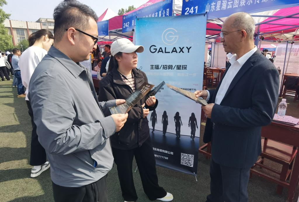 招聘会现场,学院领导及教师依次走访了山东星瀚云图娱乐传媒有限公司、曲阜迈乐文化传媒有限公司、济南市深泉外国语学校、山东芒果教育科技有限公司等多家用人单位,与企业负责人就行业发展趋势、岗位需求变化及人才培养方向等内容进行了深入交流,细致了解了企业在专业能力、综合素质等方面的具体用人要求。田荣林结合学院办学特色和人才培养成果,积极向企业推荐优秀毕业生,推动校企对接平台建设,助力毕业生高质量就业。
