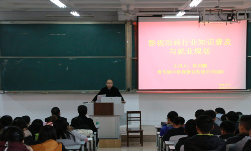 于A105举办了“影视动画行业知识普及与就业规划”报告会。青岛蜗牛影视策划有限公司CEO崔明鹏、蜗牛影视策划有限公司市场部经理崔业涛、海棠文化