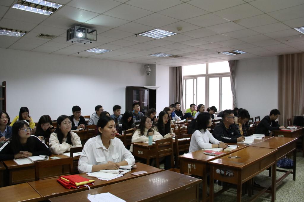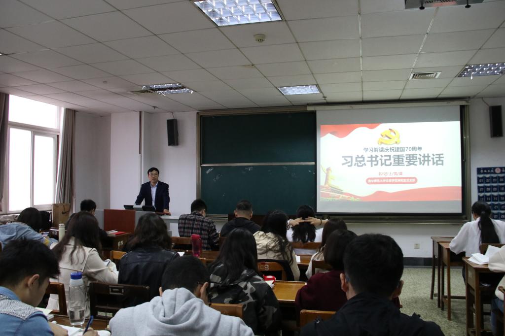 研究生党支部书记吴运明同志在C610给研究生党员上党课,学习解读庆祝建国70周年习总书记重要讲话,海棠文化